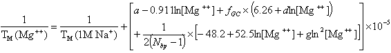 where fGC is the fraction of GC base pairs and Nbp is the number of base pairs. The monovalent ion or the divalent ion correction equations are used depending on the following ratio R of [Mg++] and [Na+].