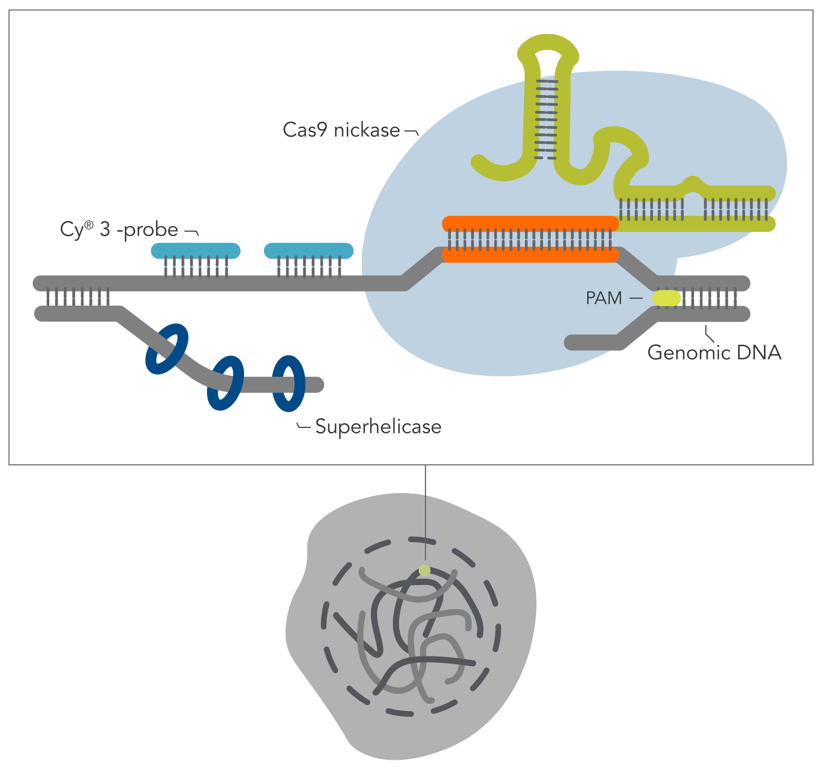 Building on the work from the Wu lab by combining the visualization breakthroughs of Oligopaints, with the ability of a CRISPR Cas9 enzyme to access DNA that is often tightly bound and inaccessible in nucleosomes, Yanbo Wang and associates (John Hopkins) have developed a new DNA FISH method—genome oligopaint via local denaturization (GOLD) FISH. With the GOLD FISH innovation, a Cas9-helicase fusion protein targets and denatures gDNA for probe binding. In contrast to FISH, GOLD FISH takes this modified Cas9 protein that targets superhelicase activity to specific genomic regions, and locally unwinds the DNA at physiological temperatures.